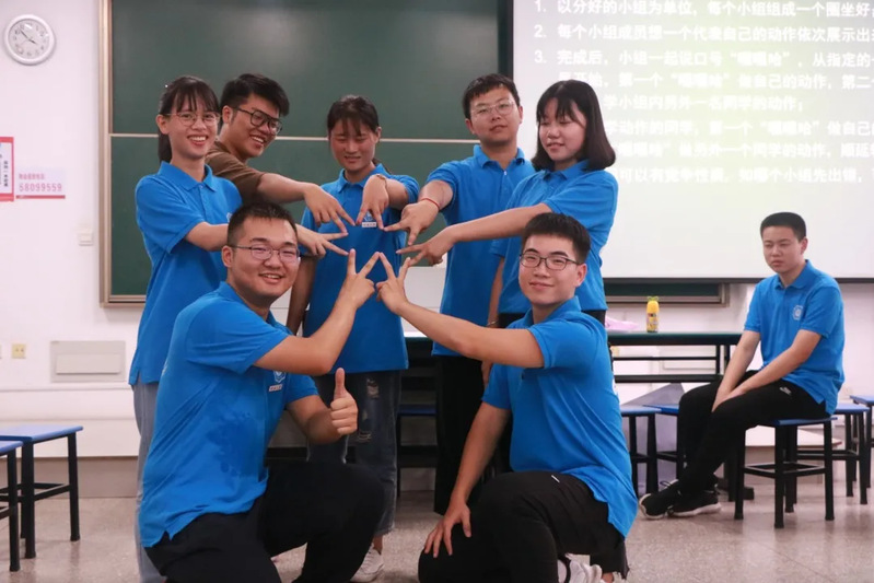“你做我学”环节,每个同学想出一个代表自己的独特手势,在齐声的“嘿嘿哈”中按照游戏规则变换着手势,每当有同学因跟不上节奏或者忘记手势而出错,会受到相应的“惩罚”。