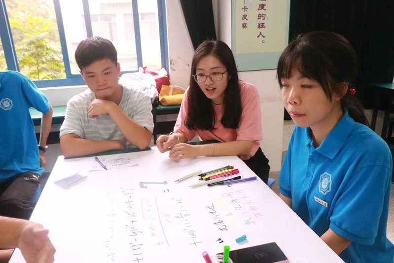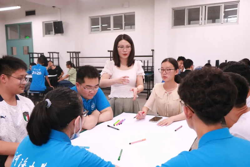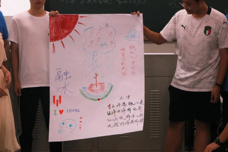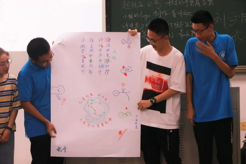 “我的团队我的团”环节,在轻松欢快的背景音乐下,同学们大开脑洞,释放创作热情,在半个小时的时间内创作出带有团队成员名字的诗歌,并画出独特的团队LOGO。后面的展示阶段,同学们更是各显才能,展现创作风采。