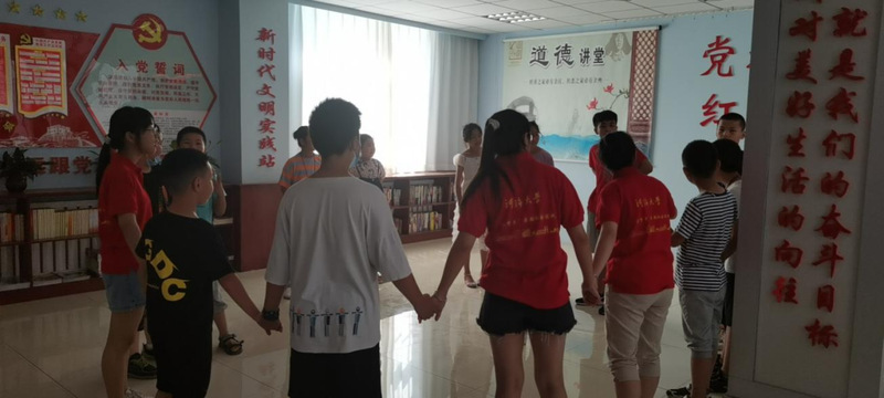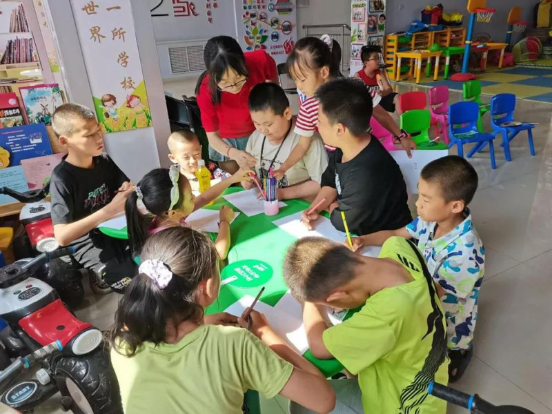 支教同学在活动室中对各位小朋友集中进行作业答疑,小朋友学习阶段不同,假期作业的数量与难度也各不相同,支教同学为提前做完当天作业的同学准备了课外书以供阅读和学习。