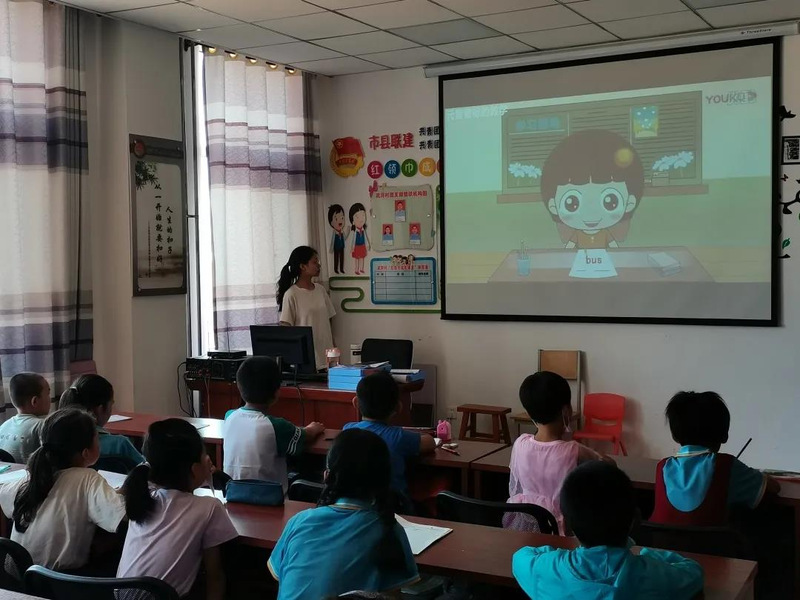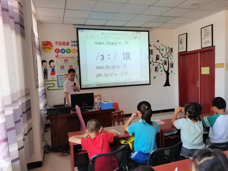 在英语课上,支教队员林伟杰耐心地把一个一个音标的教给同学们,并且保证同学们记录下每一个音标,充分调动了同学们的热情。在支教队员林伟杰的教导下,同学们对音标有了初步的了解,随后支教队员樊依娜以动画的形式让小朋友复习刚刚学习的音标。