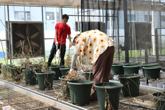 因久未清理,大棚内杂草丛生,一些种植盆栽里是枯死的植株,再加上炎炎烈日和大棚内的闷热,清理的难度大大增加。