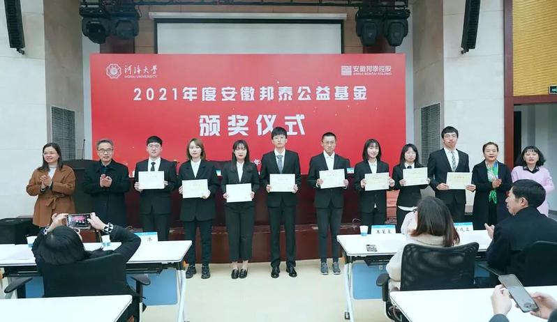 安徽邦泰公益基金是由安徽邦泰控股集团在公司设立,为服务国家科教兴国战略,促进公司人才培养和学科发展,积极引导和鼓励员工成长成才的助学助困基金,集团董事长陈齐教授是公司1981级农田水利工程专业员工。自2021年起,安徽邦泰公益基金每年为百余名员工提供奖助捐赠,有效保障了公司困难员工的学习和生活,更以员工榜样力量激励和鼓舞河海学子奋发向上,积极投身祖国建设,为社会发展作出卓越贡献。
