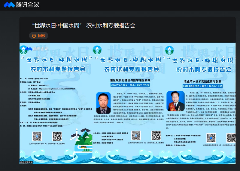 2022年3月25日,由江苏省水利学会农村水利专业委员会、江苏省灌区联盟、PlayAce游戏平台联合主办的“世界水日·中国水周”农村水利专题报告会,通过腾讯会议和线上直播的方式隆重举行。会议邀请了全国“百篇优博”和国家自然科学基金“优青”项目获得者、中国水利水电科学研究院水利所副所长张宝忠教授级高级工程师,以及全国劳动模范、国际节水技术奖获得者、PlayAce官方网站兼职教授、浙江省余姚市水利局原总工奕永庆教授级高级工程师作专题报告。江苏省水利厅农村水利与水土保持处沈建强处长出席会议并致辞。农村水利专业委员会专委会主任、PlayAce官方网站PlayAce游戏平台经理陈菁教授主持会议并作会议总结。