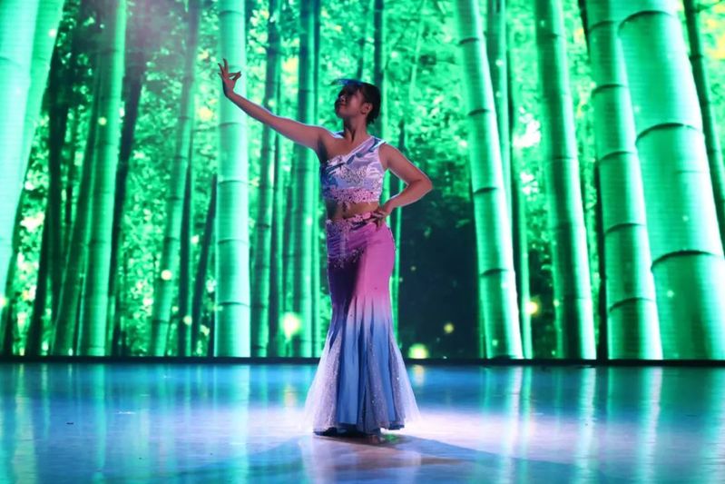 月影婆娑下,傣家少女轻轻起舞;竹影摇曳下,抬头望月照人流转。竹楼幽幽,孔雀灵动;彩云之南,如梦如幻。王禹涵同学带来的独舞《灵》将灵动与静婉相辅相成,让每一位观众感受到民族风情的别样多情,祖国大地广袤无垠的美丽梦幻。